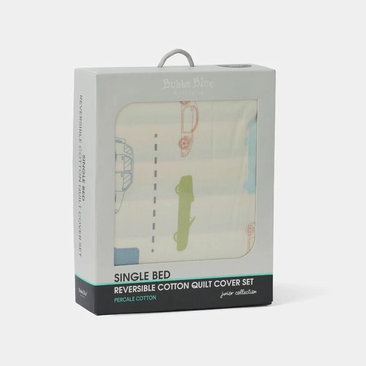 This stylish Bubba Blue Beep Beep Quilt Cover Set Single Bed features a graphic car and truck print front and classic stripe pattern reverse. On a neutral sand base with pops of ocean blue, green and rust, this set will look stunning in any room. Co-ordinating sheets and accessories available.