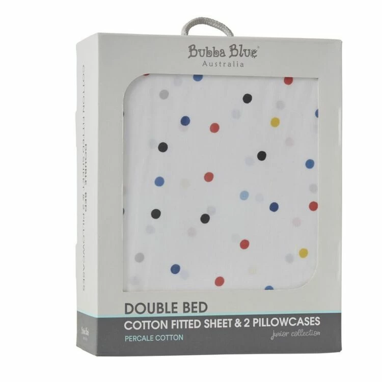 Add a touch of fun to your little one’s bedroom with the Bubba Blue Galactic Sky 225 Thread Count Cotton 3 Piece Combo Sheet Set Double Bed, made from a soft and smooth cotton/polyester blend for all year comfort! Featuring scattered polka dots in primary colours, this fun fitted sheet and 2 matching pillow cases co-ordinates perfectly with the Galactic Sky Quilt Cover set.