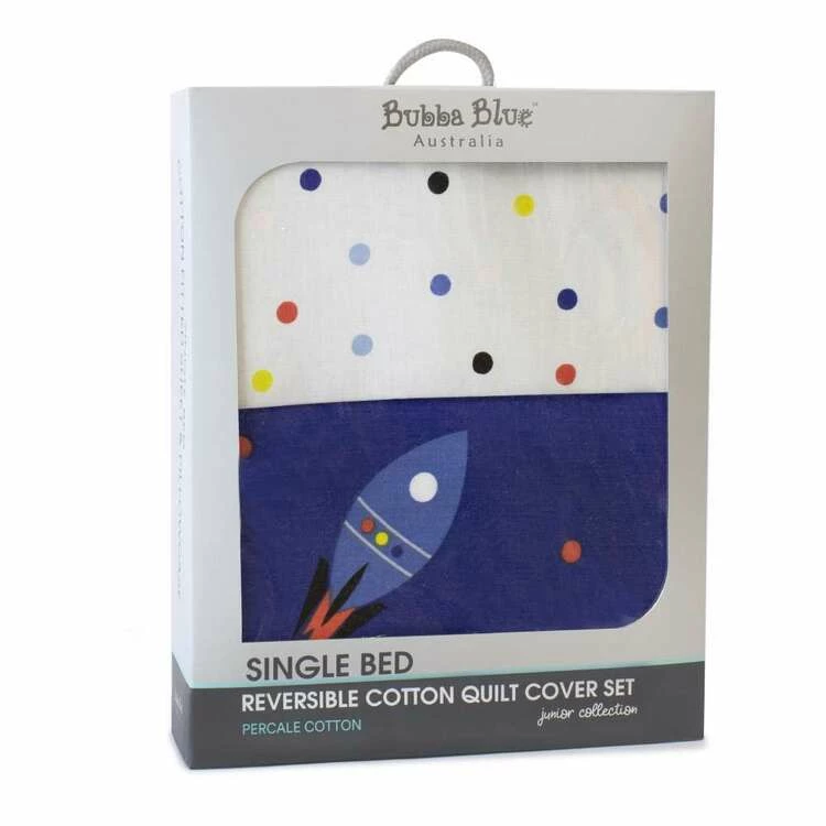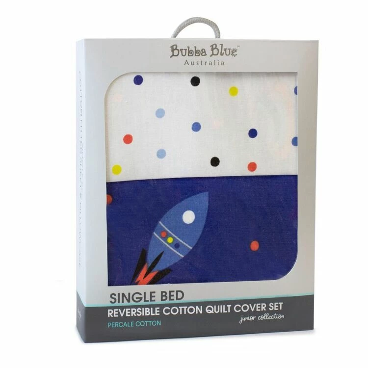 A perfect pick for the burgeoning space enthusiast, the Bubba Blue Galactic Sky 225 Thread Count Cotton Quilt Cover Set Single Bed features a fun rocket and space themed front and bright confetti dot reverse! With an included double bed quilt cover and matching pillow case, this sheet set is perfect for completing any space themed bedroom design. Let your little one blast off and enjoy a sound, restful sleep dreaming of bright stars and boundless galaxies!