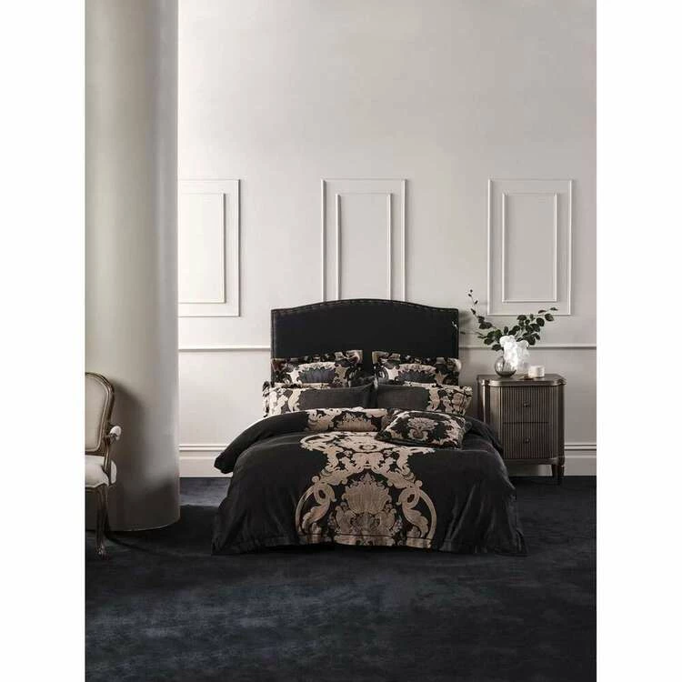 A luxury jacquard that exudes a master-bedroom feel, the Linen House Dionisia Quilt Cover Set features a classic damask design with its sophisticated combination of black and gold. An aesthetic that is both timeless and modish, this beguiling jacquard is finished with a tailored edge, complete with satin-stitched borders and looks superb styled with its coordinating European pillowcases and fringed cushion.