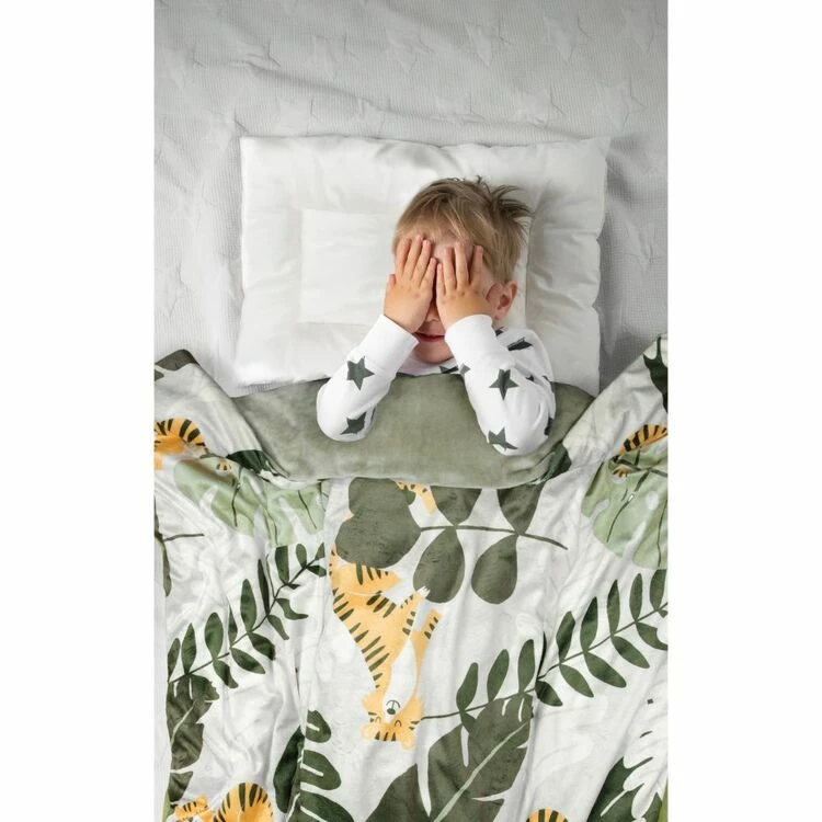 The Jelly Bean Kids George Weighted Blanket 95x125cm is designed to assist kids with getting a good night’s sleep they need by providing gentle pressure wrapped in a soft, stimulating cover. Playfully illustrated tigers and jungle leaves decorate the front that is complimented with a plain dyed plush reverse.