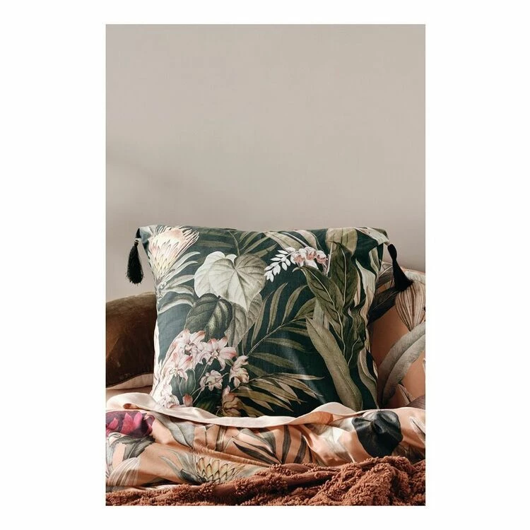 The Linen House Tillie 65x65cm European Pillowcase features an elegant tropical floral design printed on a textured cotton base, combining style and plush comfort. Ivy green euros, cockatoos and tropical silhouette accessories finish this look. Velvet, fur and linen all feel at home in this story.
